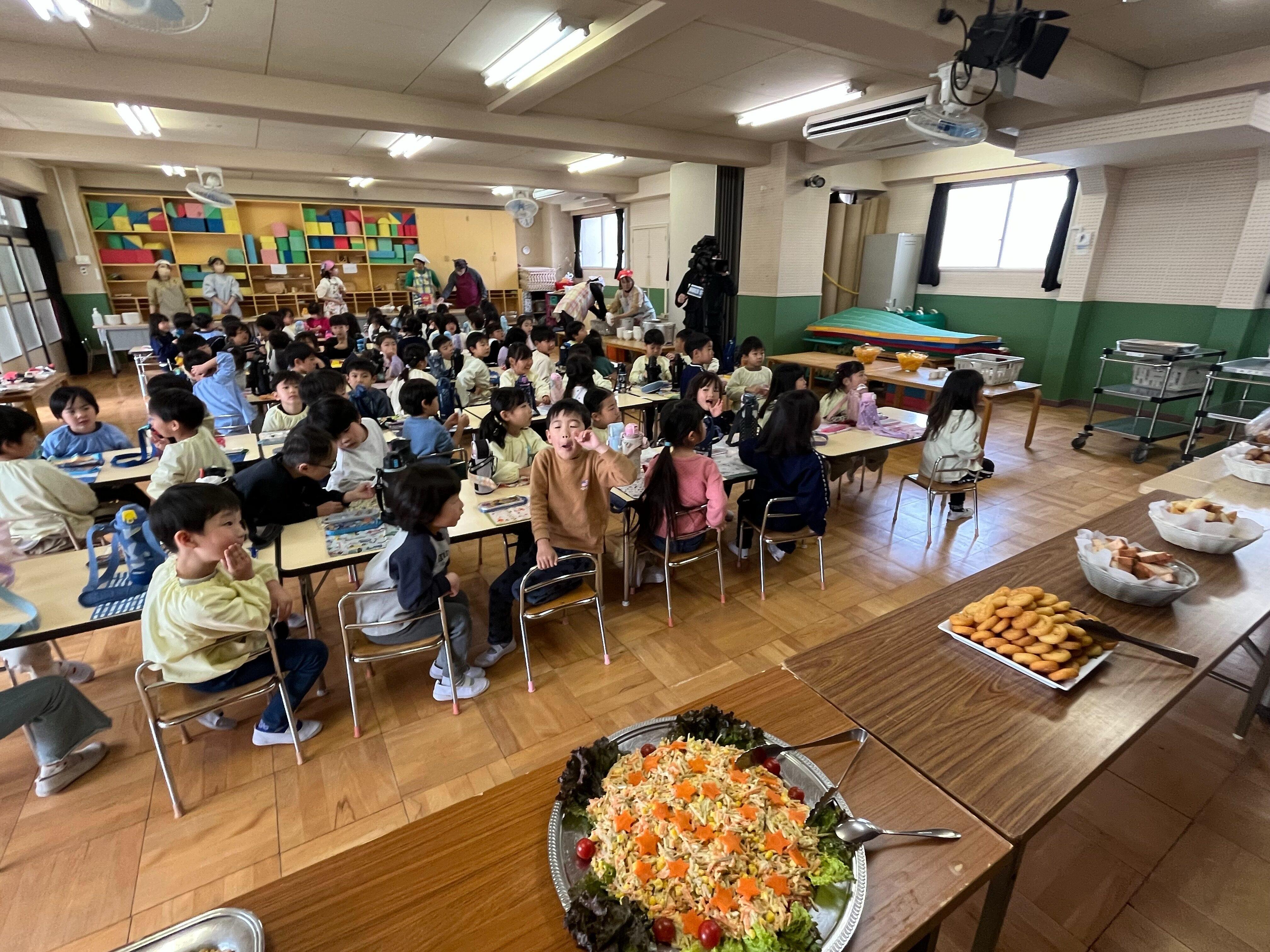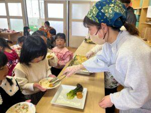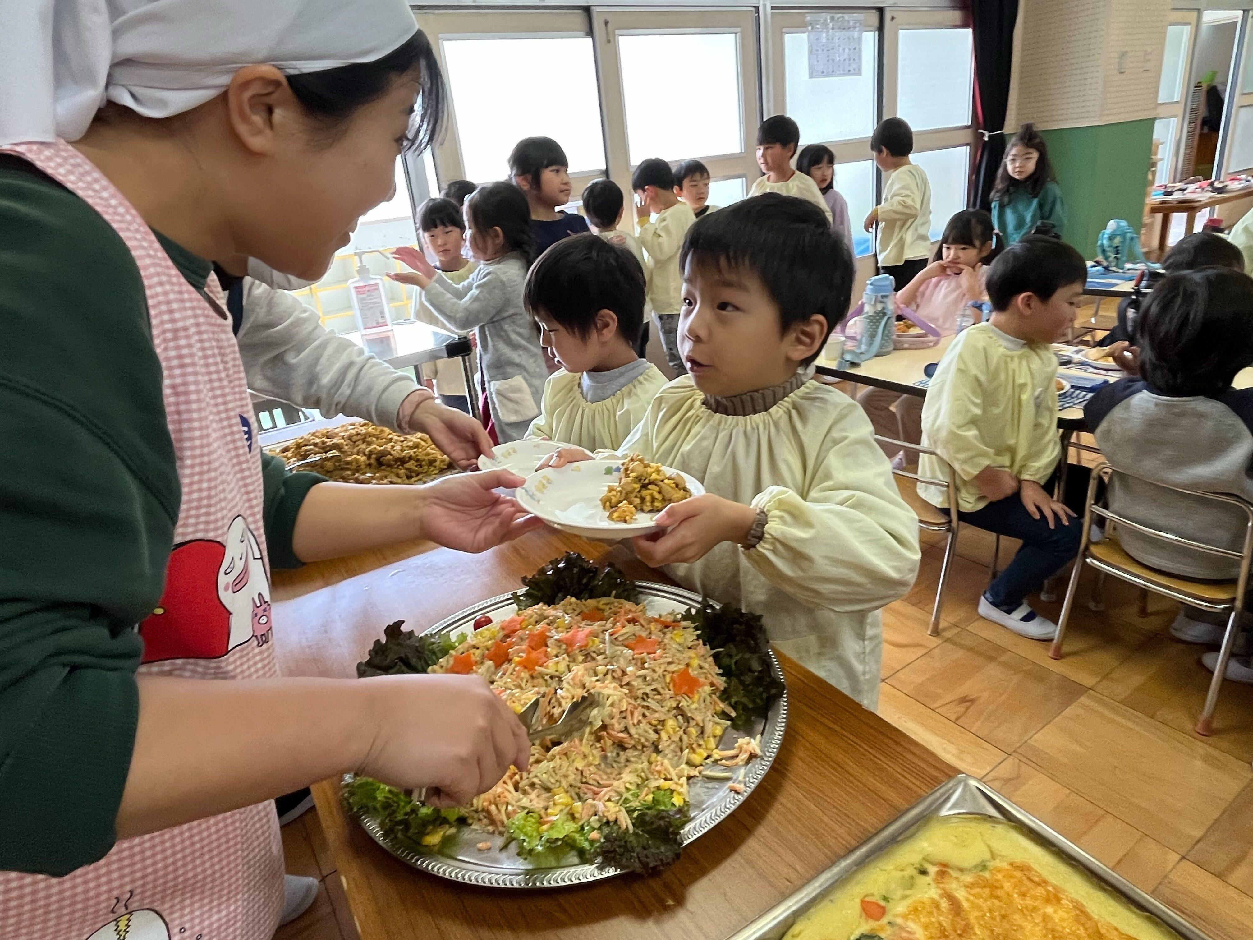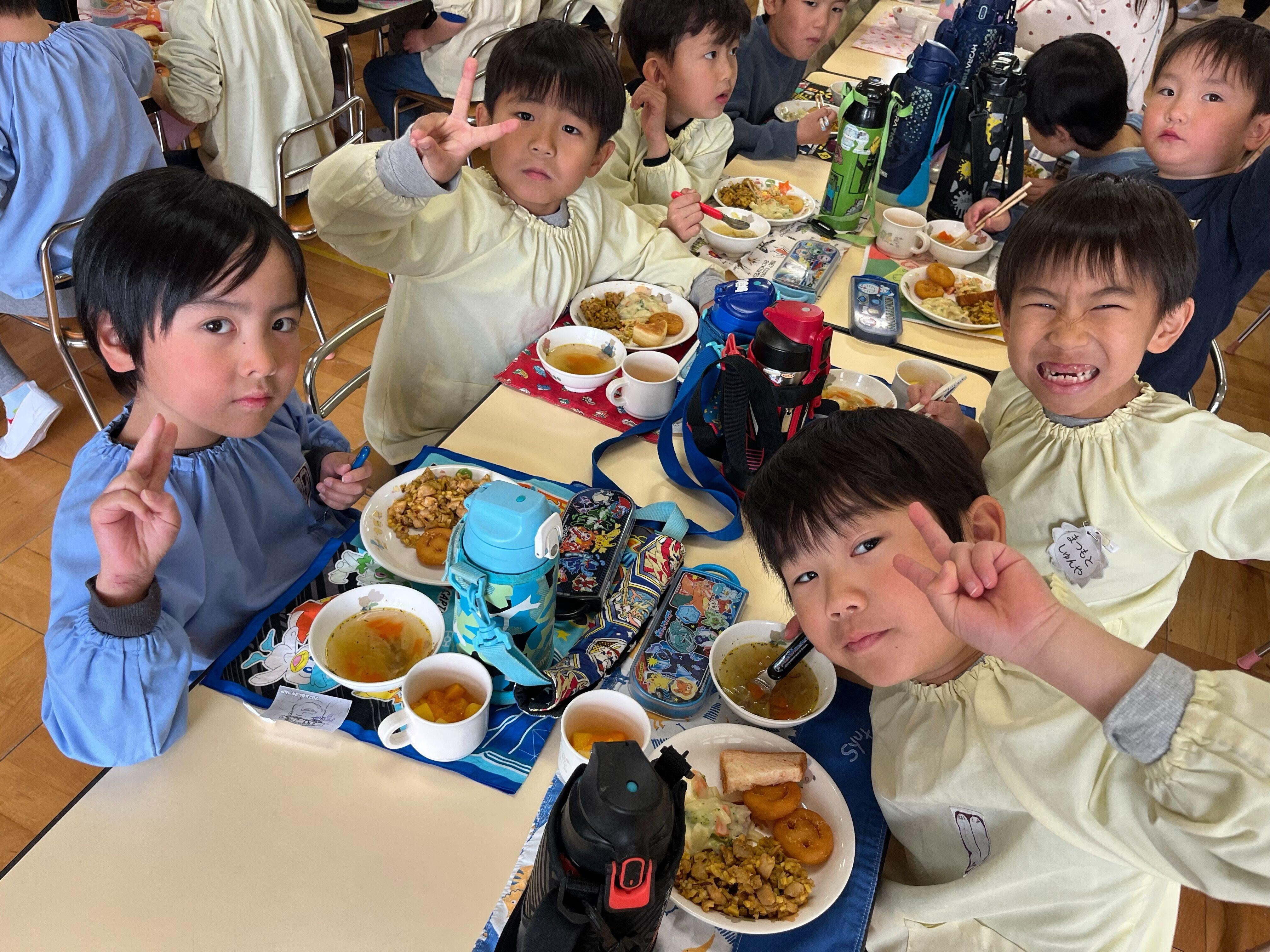 年長バイキング 2026/03/132026/03/13 メニューは、 パン3種類、グラタン、タンドリーチキン、コーンとごぼうのサラダ コンソメスープ、スマイルポテト、フルーツポンチでした! 食べ終わった子どもたちにどうだった?と聞くと 「美味しかったー!」「全部食べた!」と嬉しそうに教えてくれました。 調理員さん、役員さんありがとうございました!